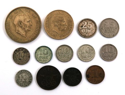 1 øre 1907 og 1922, 2 øre 1912, 10 øre 1907(2), 1914(2), 1916 og 1920, 25 øre 1919 og 1921, 1 kr 1947 og 2 kr 1956