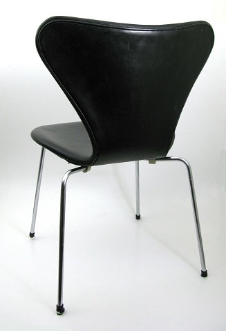 Arne Jacobsen 7'er stol model AJ 3107, skal af formbøjet krydsfinér, betrukket med sort anilin læder, stel af forkromede stålrør. Sæde H. 44 cm. Fremstillet hos Fritz Hansen.