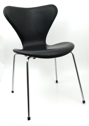 Arne Jacobsen 7'er stol model AJ 3107, skal af formbøjet krydsfinér, betrukket med sort anilin læder, stel af forkromede stålrør. Sæde H. 44 cm. Fremstillet hos Fritz Hansen.