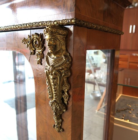 Vitrineskab af mahogny finér med messingbeslag i empire form. Rigt dekoreret med maskaroner, akantusblade og volutter af messing samt kantgarniture, ligeledes af messing. Glas i låge og i siden samt 3 indvendige glashylder. 107 x 142 x 32 cm. 20. årh. begyndelse.