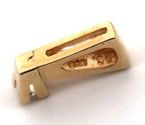 Vedhæng af 14 kt. guld, prydet med brillantsleben diamant på 0,03 ct.. L. 11,5 mm., samlet vægt ca. 1 gr.