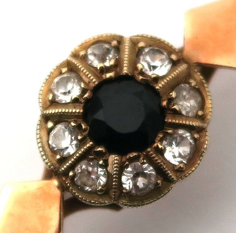 Nål af 14 kt. guld, prydet med blå safir, omkranset af 8 klare safirer. L. 48 mm., samlet vægt ca. 3 gr.