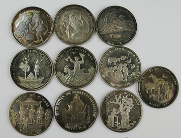 Hans Christian Andersen medaillesæt, præget med forskellige eventyrmotiver. Revers portræt af H.C. Andersen i forskellige positioner. Finsølvindhold 150,8 gr.