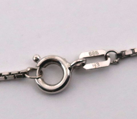 Halskæde og vedhæng af 14 kt. hvidguld, prydet med brillantsleben diamant på 0,10 ct., samlet vægt ca. 5,5 gr.