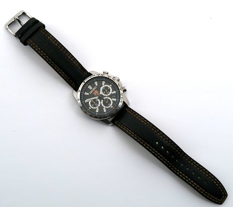 Seiko herrearmbåndsur, ref nr. SSBO-73P2 i urkasse af stål. Sort skive med stregindikation, central- og separat sekundviser, datovisning i #4½ position samt chronograph funktioner. Quartzværk. Urkasse diameter 40 mm. Læderrem med Seiko metalspænde.