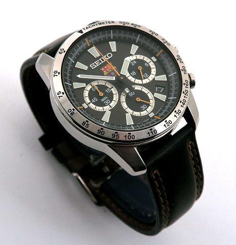 Seiko herrearmbåndsur, ref nr. SSBO-73P2 i urkasse af stål. Sort skive med stregindikation, central- og separat sekundviser, datovisning i #4½ position samt chronograph funktioner. Quartzværk. Urkasse diameter 40 mm. Læderrem med Seiko metalspænde.