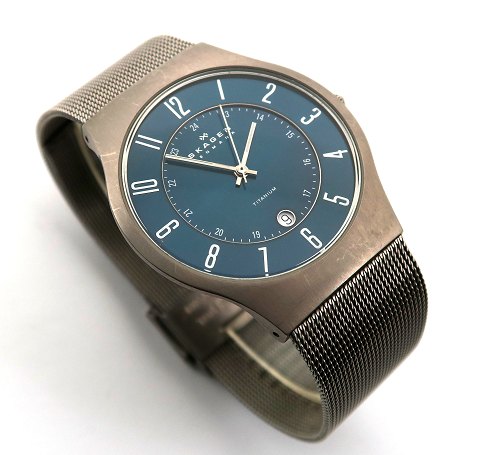 Skagen herrearmbåndsur, ref. nr. 233XLTTN i urkasse og med lænke af titanium. Stålblå skive med stregindikation og arabertal, central sekundviser og datovisning i #6 position. Quartzværk. Urkasse diameter 38 mm.
