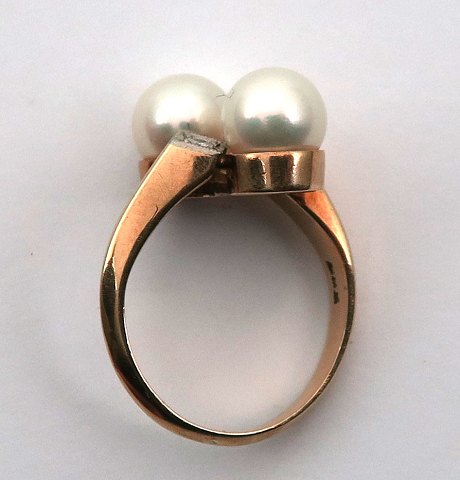 Cross-over ring af 14 kt. guld, prydet med 2 brillantslebne diamanter på samlet 0,06 ct., ydermere prydet med 2 tværliggende, 6½ mm. kulturperler. Ring Str. 49, samlet vægt 5,5 gr.