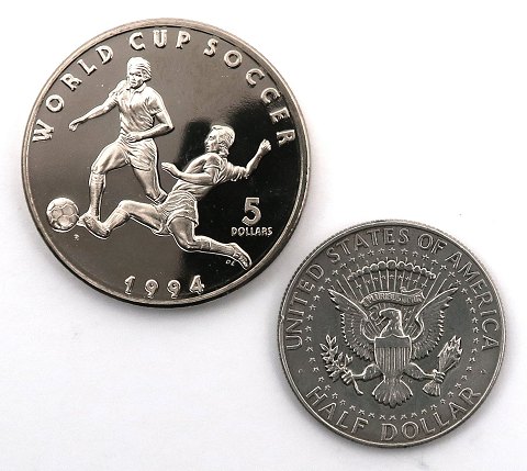 Lotbestående af Marshall Islands 5 Dollars 1994 *World Cup Soccer* - proof, samt Half Dollar 1967 *Kennedy*