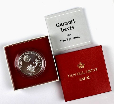 Medaille af finsølv, præget hos Den Kgl. Mønt i anledning af, at Danmark vinder Europamesterskabet i fodbold i 1992. Ø. 38 mm.