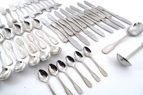 Gense Attaché, gl. riflet bestik af rustfrit stål bestående af 16 middagsskeer, 16 middagsknive, 15 middagsgafler, 6 kaffeskeer samt potageske og kartoffelske. Tåler opvaskemaskine.