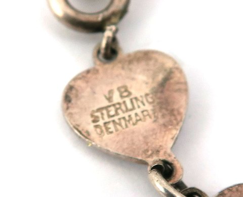 Børnesmykker, lot bestående af armlænke og broche af sterling sølv med led i form af sommerfugle. Lænke L. 15,5 cm., broche diameter 28 mm., samt halskæde og armlænke af sterling sølv med led i form af hjerter og dråber. Kæde L. 35 cm., lænke L. 15 cm.