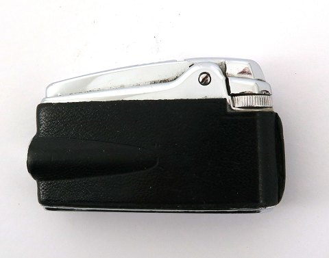 Ronson gaslighter *Varaflame* af forkromet metal, beklædt med sort læder, 70 x 40 x 15 mm.