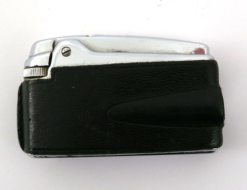 Ronson gaslighter *Varaflame* af forkromet metal, beklædt med sort læder, 70 x 40 x 15 mm.