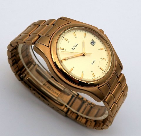 Zola Dressman herrearmbåndsur i urkasse og med lænke af stål. Champagnefarvet skive med stregindikation, central sekundviser og datovisning i #3 position. Quartzværk. Urkasse diameter 38 mm.