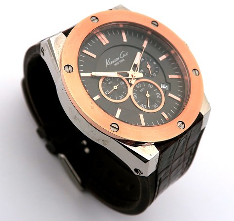 Kenneth Cole New York herrearmbåndsur i urkasse af stål med påsat kobberring . Brun tonet skive med stregindikation, central sekundviser, datovisning i #4½ position samt chronograph funktioner. Quartzværk. Urkasse diameter 47 mm.