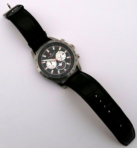 Jaques Lemans Sports chronograph herrearmbåndsur, ref. 1-1636 i urkasse af stål. Sort skive med stregindikationer, central sekundviser, datovisning i #6 positionen, tachtmeter samt chronographfunktioner. Quartsværk. Urkasse diameter 51 mm., sort croco læderrem med metalspænde.