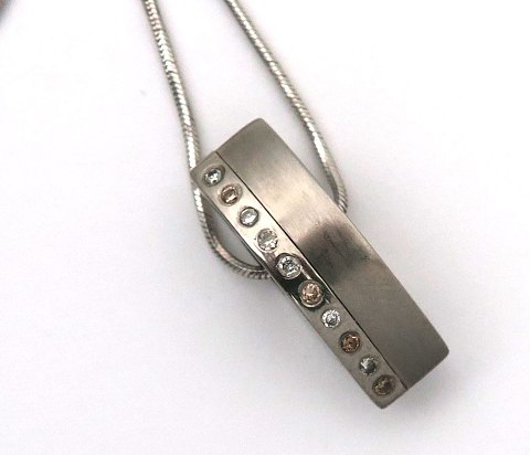 Halskæde af 14 kt hvidguld med vedhæng af metal (platin?) og segment af hvidguld, prydet med 10 brillantslebne diamanter på tilsammen 0,05 ct. Kæde L. 44 cm.