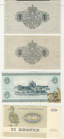 5-kronesedlen med en "kaffeplet", ellers meget pæne.