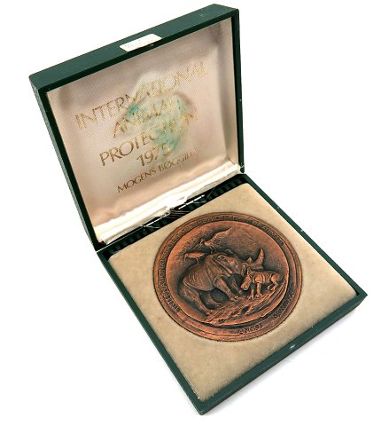 Medaille af bronze, tegnet af Mogens Bøggild og udgivet i anledning af det internationale dyrebeskyttelsesår 1975. Diameter 70 mm., vægt 264 gr.