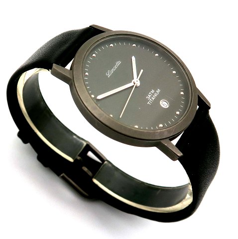 Lancetta armbåndsur, ref. nr. 19122 i urkasse af titanium. Koksgrå skive med punktindikation, central sekundviser og datovisning i # 6 position. Quartzværk. Urkasse diameter 35 mm. Læderrem med spænde af titanuim.