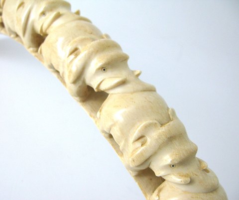 Stødtand fra afrikansk elefant med skæringer i form af elefanter på række, ved roden afsluttet med bladværk.