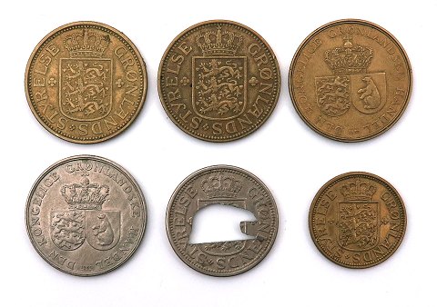 Grønland. 50 øre 1926, 2 x 1 kr 1926, 1 kr 1957, 1 kr 1960. Desuden 25 øre 1926 med udsavet isbjørn.