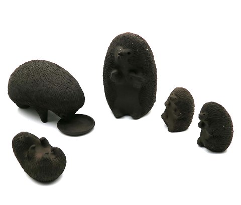 Hermann A. Kähler, pindsvin familie af mørkebrun keramik. signeret HAK og stemplet Eller Karlsen. De voksne pindsvin L. 17 cm.
