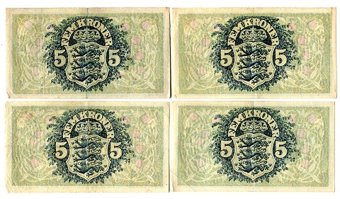 Lille samling sedler bestående af 1 kr 1921 2D, 5 kr 1939 F, 2x 1942 H og 4x 1942 J, heraf 2 i nr.-rækkefølge.