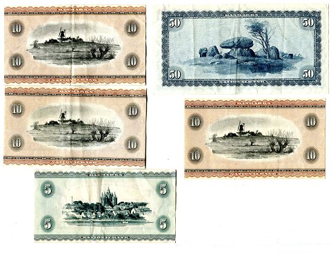 Danske pengesedler i form af 50 kr 1963 A4, 10 kr 1969 A8 0J erstatningsseddel, 10 kr 1974 D3 og 1874 D2 samt 5 kr 1958 B7.
