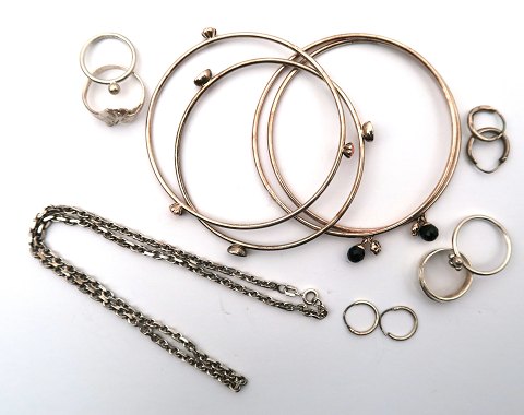Lot bestående af 4 armringe med charms, halskæde, 4 ringe og 2 par øreringe. Samlet vægt ca. 50 gr.