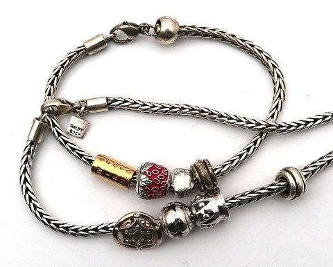 Rauff armlænke med 5 trollbeads, L. 20 cm. heraf en af forgyldt sterling sølv samt Halssmykke med 4 trollbeads, L. 43 cm.