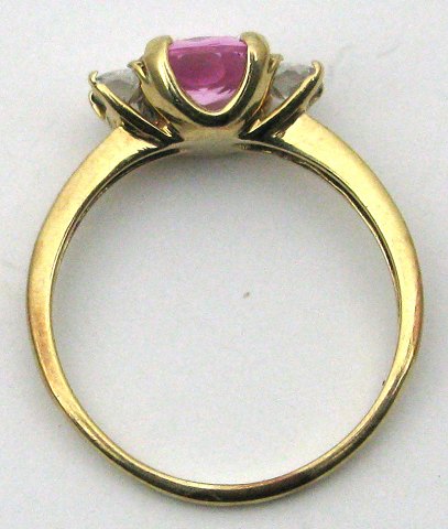 Ring af guld 14 kt., prydet med facetsleben pinkfarvet sten flankeret af hvide sten.