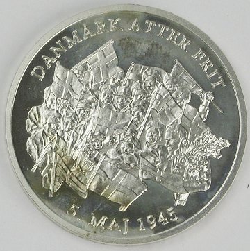 5. maj mindemedaille af sølv, præget i anledning af 50 året for Danmarks befrielse i 1995. Diam. 33 mm. Finsølvindhold 13,5 gr. Salgsetui og certifikat medfølger.