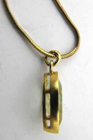 Halssmykke af forgyldt sølv med vedhæng ligeledes af forgyldt sølv, prydet med sartgrøn sten.