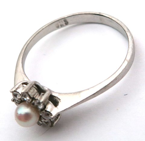 Ring af sterling sølv, prydet med 3,5 mm. kulturperle, omkransen af 9 klare safirer. Ring Str. 54½
