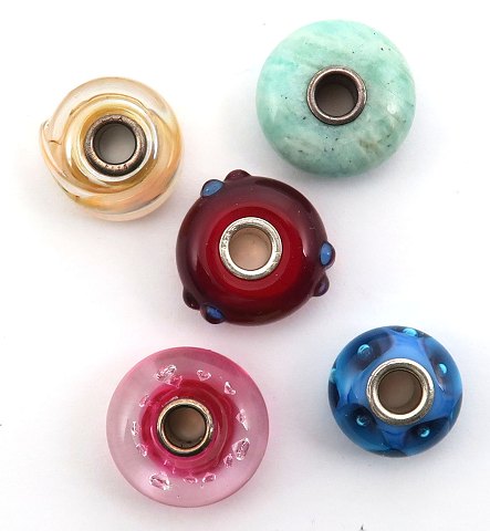 5 troldekugler til troldekuglearmbånd, af sølv, glas og sten mm.