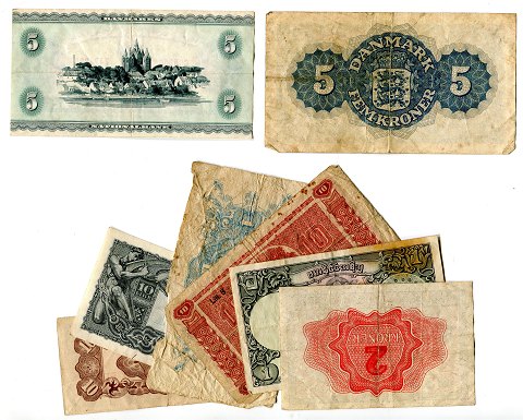 2 stk. 5 krone sedler og 6 stk udenlandske sedler