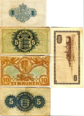 Danmark, 1 kr, 5 kr, 10 kr og 100 kr seddel 1924 - 1965 (5)