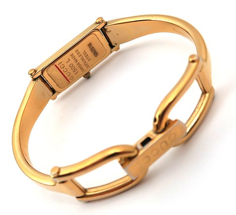 Gucci damearmbåndsur i urkasse og med lænke af forgyldt stål med rektangulær skive uden stregindikation og central sekundviser. Urkasse 12 x 25 mm. Quartzværk.