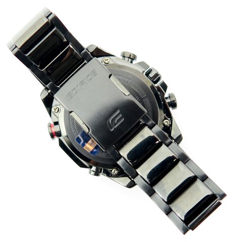 Casio Edifice Chronograph *Red Bull Racing* herrearmbåndsur, ref. EQBG-SCCRBB-2AER i urkasse og med lænke af stål. Blåtonet skive med stregindikation, regnbuefarvet lynette, central sekundviser, datovisning i #3 position og chronograph funktioner. Quartsværk. Urkasse diameter 45 mm.