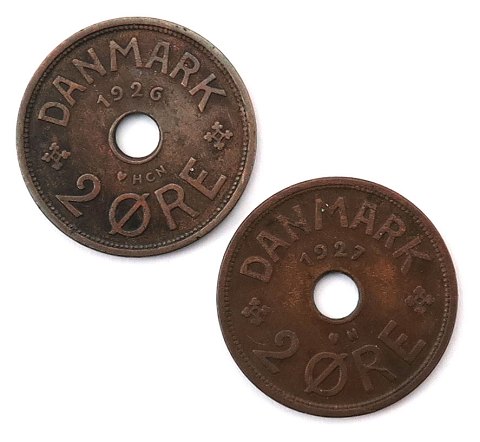 Christian X, 2 øre bronze 1926 HCN og 1927 N