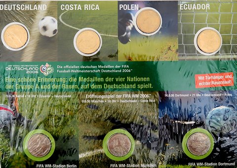Eksklusivt blisterark med 12 FIFA World Cup 2006 medailler, præget med arkitektur fra 10 spillebyer. Diameter 30 mm. Indeholder også en pose plænegræs frø, således køberen kan anlægge sin egen WM fodboldbane i baghaven :-)