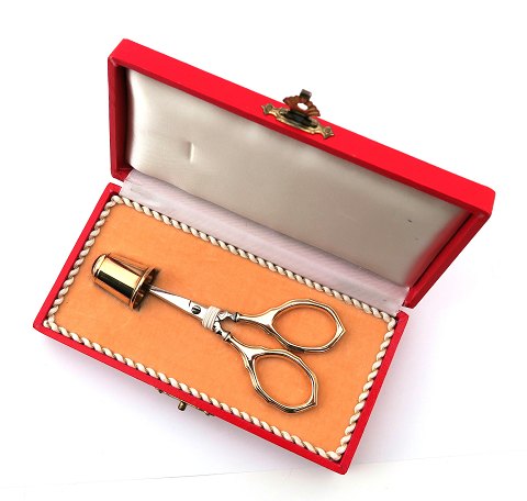 Brodersaks af 14 kt. guld med Solingen skæerblade af ædelstål samt fingerbøl af 14 kt. guld. Opbevaringsæske medfølger. Saks L. 8,5 cm.