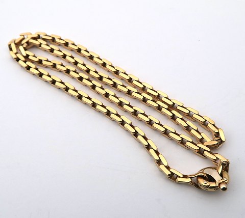 Halskæde af 18 kt. guld med blokmønstrede led og stor, dekorativ sikkerhedslukke, L. 48 cm. Vægt ca. 49 gr.