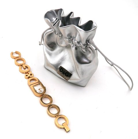 Dolce & Gabbana Time smykkeur i våbenskjold formet urkasse og med logo lænke af forgyldt stål. Skive med 12 - 3 - 9 stregindikation. Quartsværk, Urkasse 23 x 18 mm.