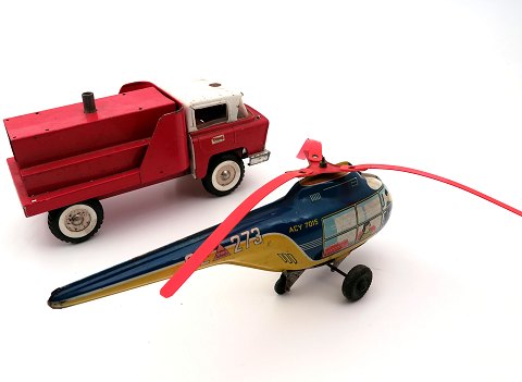 Triang flywheel brandbil CHE 4531 af metal, oprindelig med vandpumpefunktion (mangler), samt Technofix helikopter af litograferet blik med friktiosmotor. Tyskland og England omkring 1955. L. henholdssvis 33 og 29 cm.