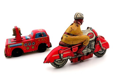 Huki legetøjsmotorcykel og TM Japan brandbil fra 1950'erne
