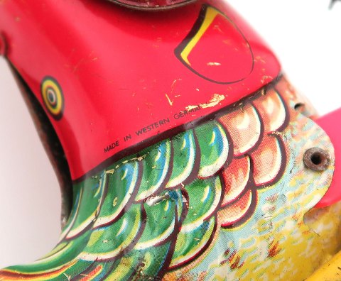 Gl. tysk bliklegetøj i form af andrik klovn på trehjulet cykel af litograferet blik. Udgave fra ca. 1955 med blikhjul. Optræksmotor. H.