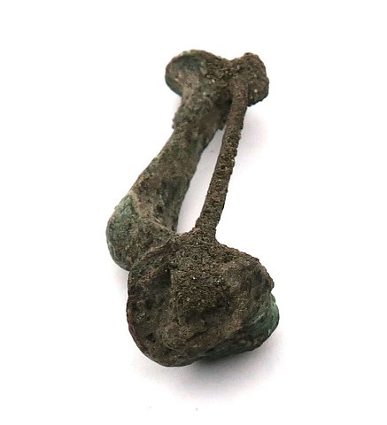 Fibula (fibel) smykkenål eller spænde med fjedereffekt, brugt til at sammenfæste dragtstykker. Proveniens: Boet efter amatørarkæolog - jordfund, ukendt fundsted. L. 34 mm., vægt 8,3 gr.